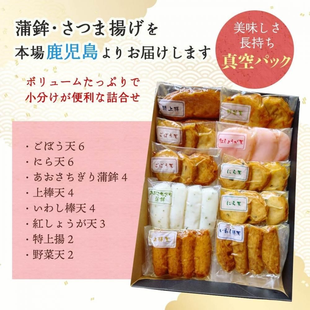 【内容量】ごぼう天 6枚、にら天 6枚、あおさちぎり蒲鉾 4枚、上棒天 4枚、いわし棒天 4枚、紅しょうが天 3枚、特上揚 2枚、野菜天 2枚