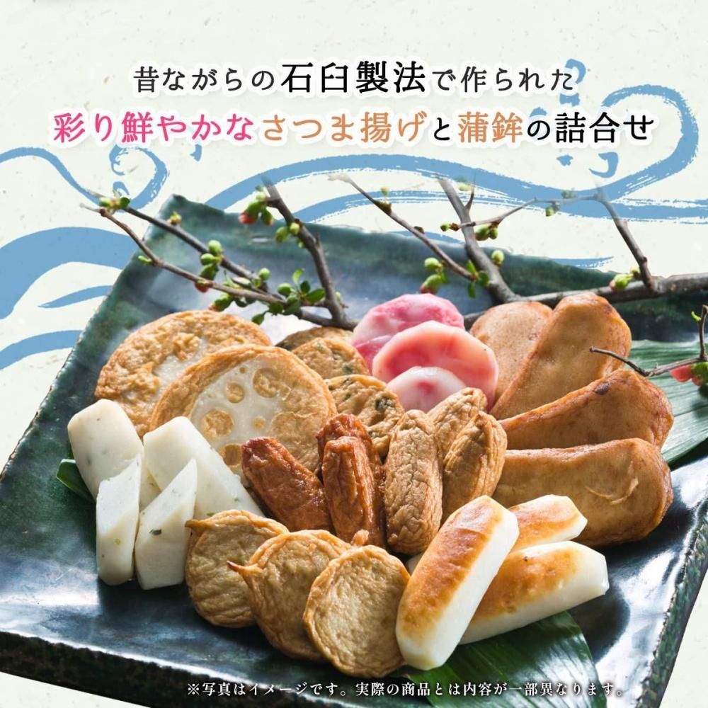 【内容量】ごぼう天 6枚、あおさちぎり蒲鉾 4枚、上棒天4枚、ちぎり蒲鉾 4枚、いわし棒天 4枚、にら天 3枚、紅しょうが天 3枚、特上揚 4枚、野菜天 2枚